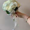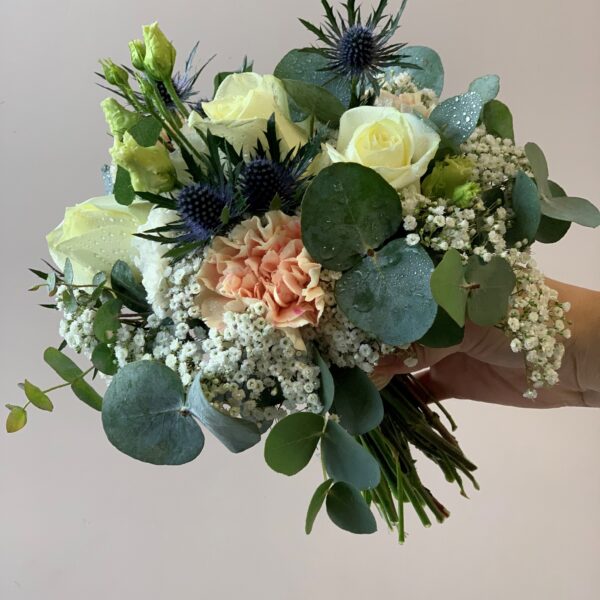 Bouquet de mariée rond blanc, pêche et bleuté avec le chardon et l’eucalyptus