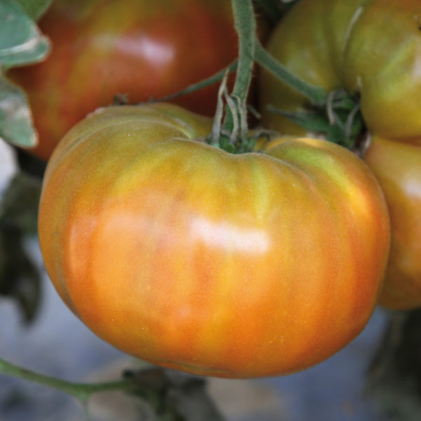 Tomate grosse, légèrement aplatie, jaune orangé marbré ❤️💛