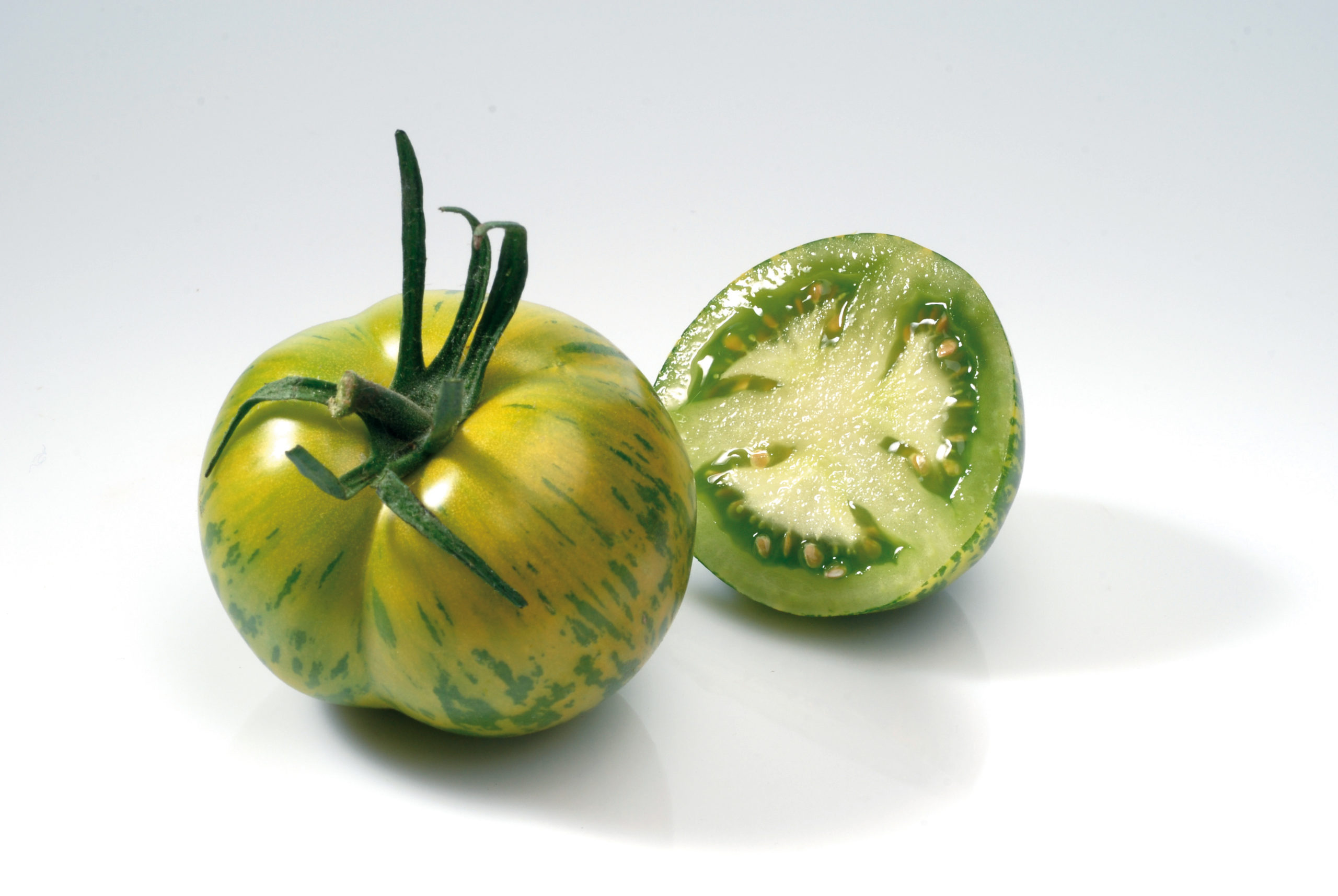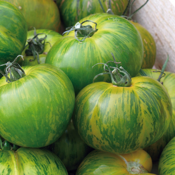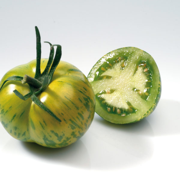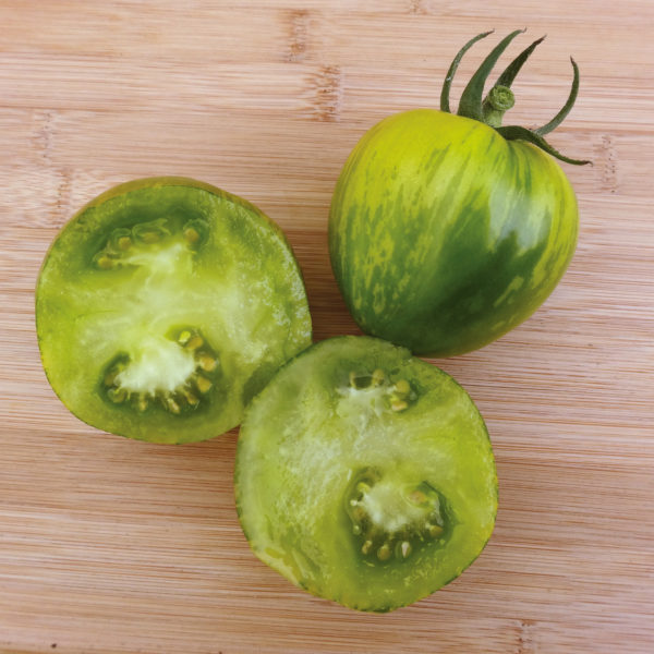 Tomate ronde vert clair zébrée de jaune, très originale 💚💛